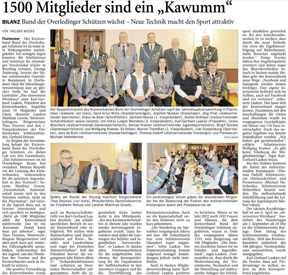Flachsmeer - Der Kreisverband Bund der Overledinger Schützen ist an seine alte Wirkungsstätte zurückgekehrt. Vor wenigen Tagen konnten die Schützinnen und Schützen ihr ehemaliges Vereinslokal wieder in Beschlag nehmen. Einzige Änderung: Anstatt der früher existierenden Gaststätte Reepmeyer in Flachsmeer fand die Jahreshauptversammlung nun an gleicher Stelle im Saal der Gaststätte „Das ehrenwerte Wirtshaus“ statt. Karl-Gerhard Laaken, Präsident des Kreisverbandes, begrüßte rund 70 Mitglieder und Gäste, darunter Landrat Matthias Groote, Westoverledingens Bürgermeister Theo Douwes und den 1. Vizepräsidenten des Ostfriesischen Schützenbundes, Gerhold Heinze.